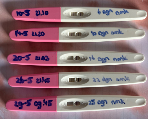 Oeh, spannend, kan dus nog alle kanten op! Ik kreeg met de termijnecho te horen dat het hartje met 7 weken gestopt was met kloppen. Hemelvaartweekend een miskraam gehad met veel bloedverlies, ambulance, nachtje ziekenhuis en ijzerinfuus. Ik dacht, zal wel een tijdje duren voordat mijn cyclus het weer oppakt na zo’n heftige miskraam. Maar als klokwerk was 25 dagen na de miskraam ongesteld, heb altijd een cyclus van 25 dagen. En ook deze maand is mijn ovulatie weer stipt op tijd. Ik heb 2 weken gebloed. Dus ik zal in de laatste dagen van het bruinverlies al weer geovuleerd hebben waarschijnlijk