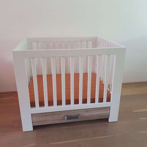 Mooie box van Kidsmill in de kleur wit met houten lade. Type Long Island. Incl matrasje, hoeslaken en boxmandje. In 3 hoogtes verstelbaar. De box heeft hele lichte gebruikerssporen, maar echt minimaal. Geen bijtafdrukken, geen schade. Maten zijn: 85 cm breed, 105 cm lang, 87 cm hoog. Lade is 11 cm hoog. Matrasje ong 4 cm hoog. Nieuwprijs was € 439,99.