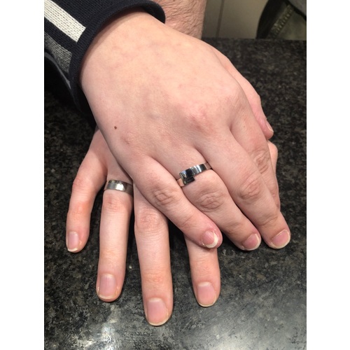 Een asring (antraciet, lijkt zwart op foto) in combinatie met een moedermelkring, omdat ik met zoveel liefde voor hem heb gekolfd toen ons zoontje te vroeg werd geboren. Zes weken later overleed hij toch. Zo is hij altijd bij mij 💛