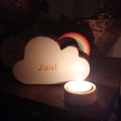 Verder hebben wij een houten kist bestelt met haar naam en datum, gewicht, lengte, tijdstip om spulletjes in te bewaren. En hebben we een keramieken urntje besteld van een wolkje met regenboog waar straks haar as in komt.